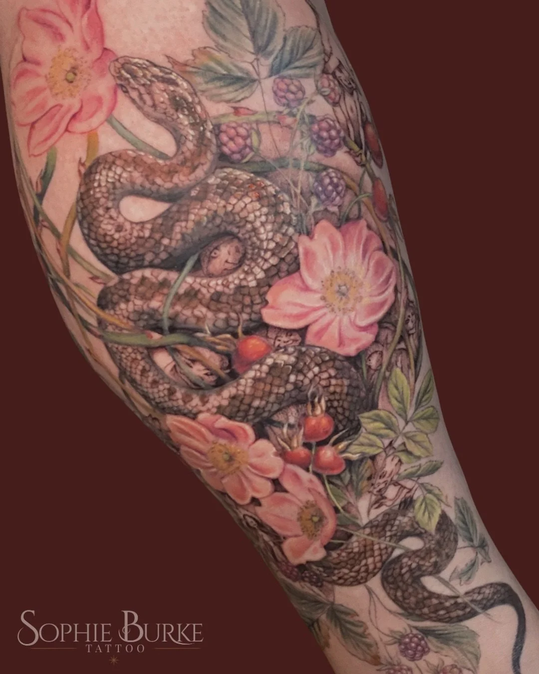 I specialise in painterly botanical and fantasy tattoo work, designed to move naturally with the body.